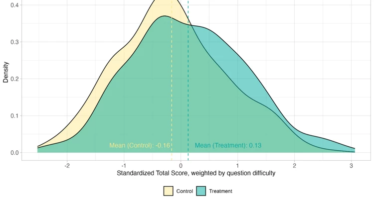 The program achieved a learning improvement equivalent to nearly two years of typical progress, with effect sizes outperforming 80% of education interventions in developing contexts. Given its short duration, this outcome highlights the efficiency and scalability of AI-driven tutoring programs when combined with teacher guidance.